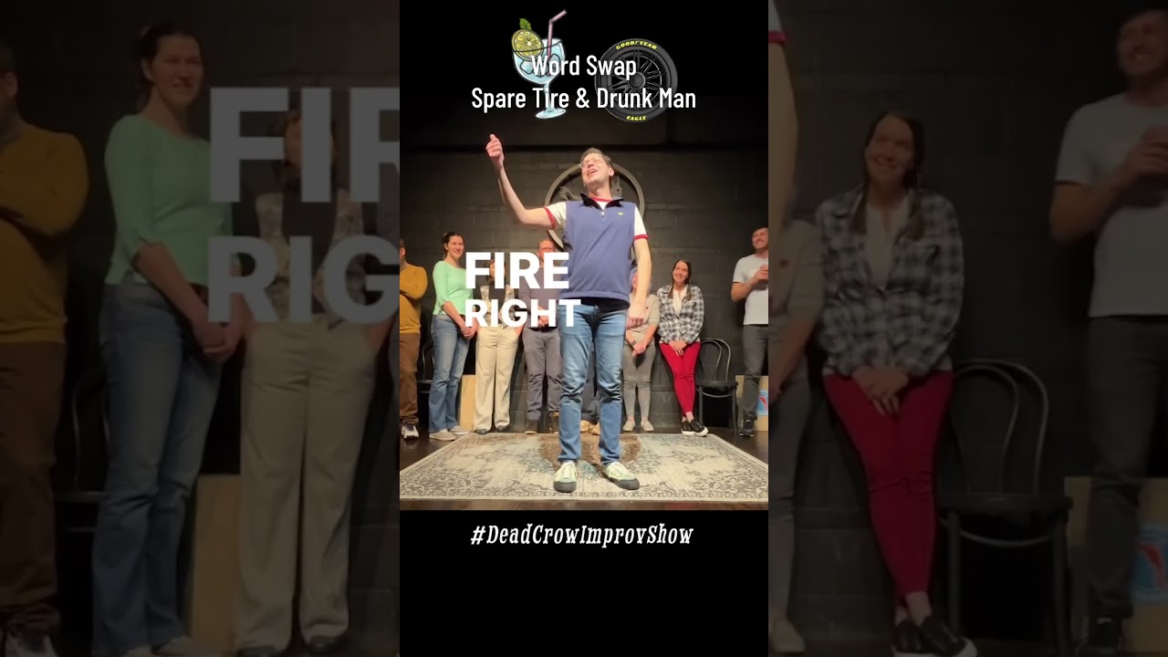 A short clip from DareDevil Improv Comedy playing Word Swap, a game in which players substitute key words mid-scene. The round uses the suggestions "spare tire" and "drunk man."